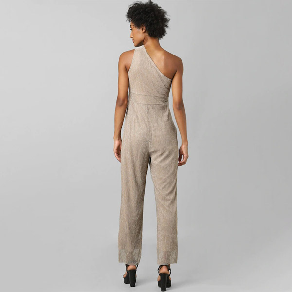 • Beige self design basic jumpsuit ,has a one shoulder, sleeveless, na pockets